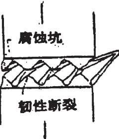 隙道腐燭模型認(rèn)為,在平面排列的位錯(cuò)露頭處,或者新形成的滑移臺(tái)階處,處于髙 應(yīng)變狀態(tài)的金屬原子發(fā)生擇優(yōu)腐蝕。腐蝕沿著位錯(cuò)線向縱深發(fā)展,形成遂洞。當(dāng)應(yīng)力作 用存在時(shí),遂洞之間的金屬產(chǎn)生機(jī)械撕裂。當(dāng)機(jī)械斯裂停止后,又重新開始隨道腐蝕, 最終導(dǎo)致了裂紋的不斷擴(kuò)展,至金屬斷裂。如圖1.4所示。